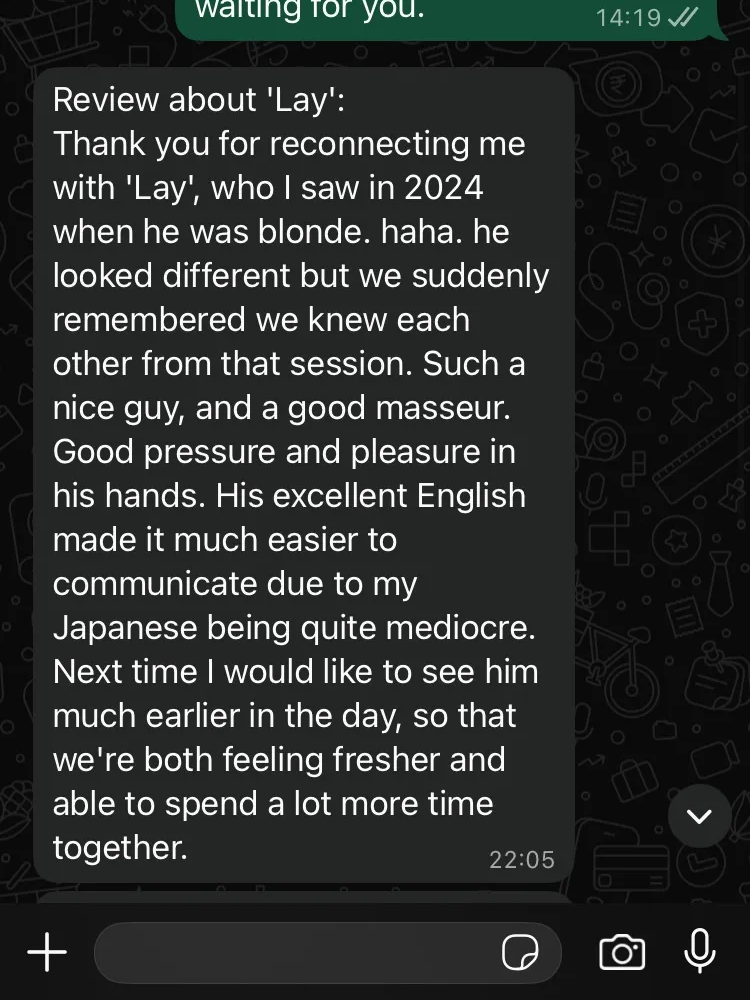 2024年に会った「レイ」と再びつないでくれてありがとうございます。あの時、彼は金髪でした(笑)。見た目は変わっていましたが、お互いあのセッションで会ったことをすぐに思い出しました。本当に感じの良い人で、腕のいいマッサージ師です。手の圧が心地よく、とても気持ちよかったです。私の日本語がかなり拙いので、彼の流暢な英語のおかげでコミュニケーションがとても簡単になりました。次回はもっと早い時間帯に会いたいです。お互いフレッシュな状態で、もっと長く一緒に過ごせますから。